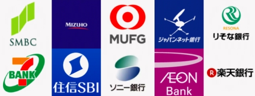 楽天銀行・じぶん銀行・住信SBIネット銀行・三菱東京UFJ銀行・ジャパンネット銀行・セブン銀行・ゆうちょ銀行・りそな銀行・関西アーバン銀行・三井住友銀行